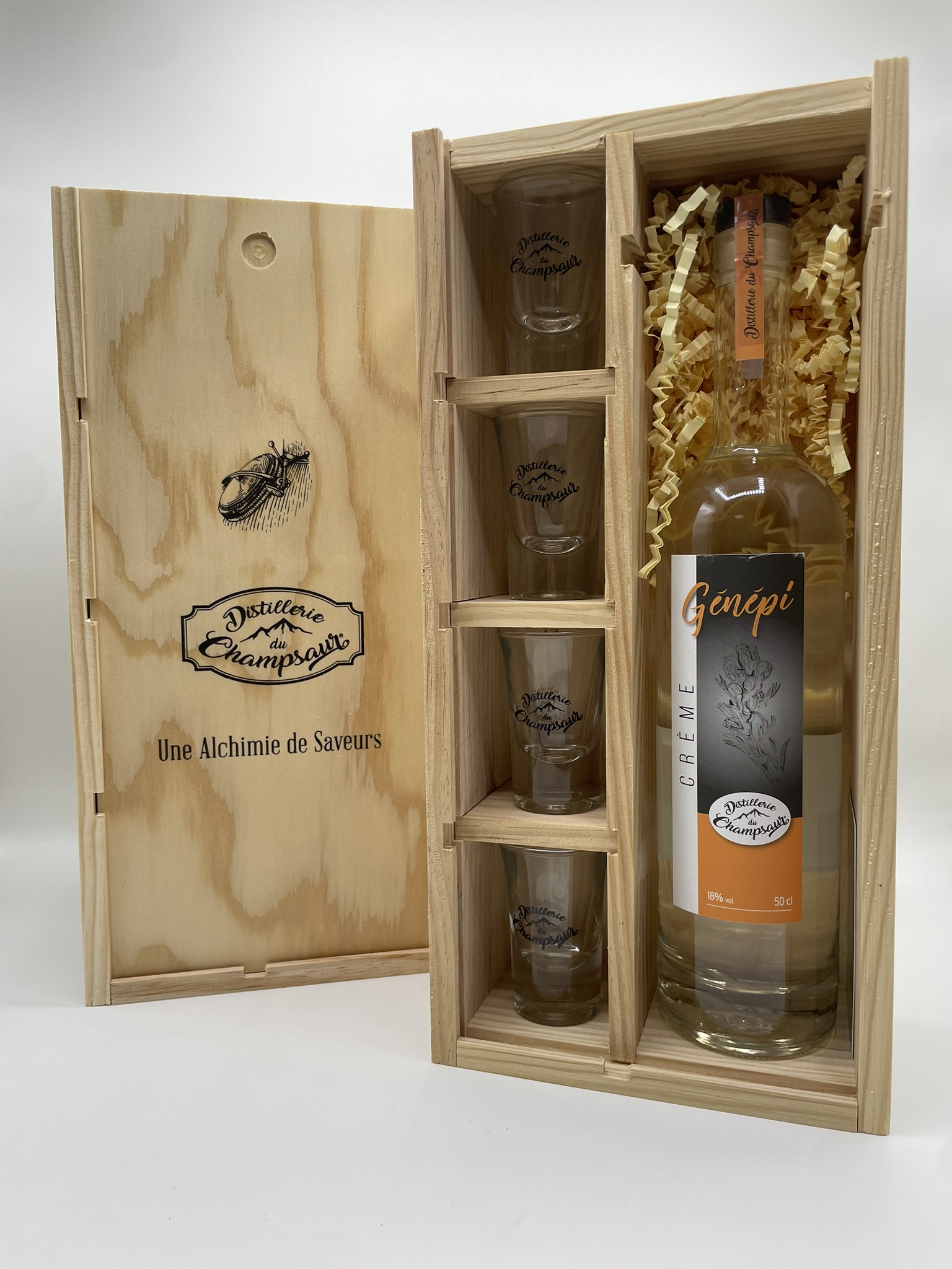 Coffret contenant une bouteille de crème de génépi en 50cl, ainsi que 4 verres "shooter" pour le déguster en digestif.