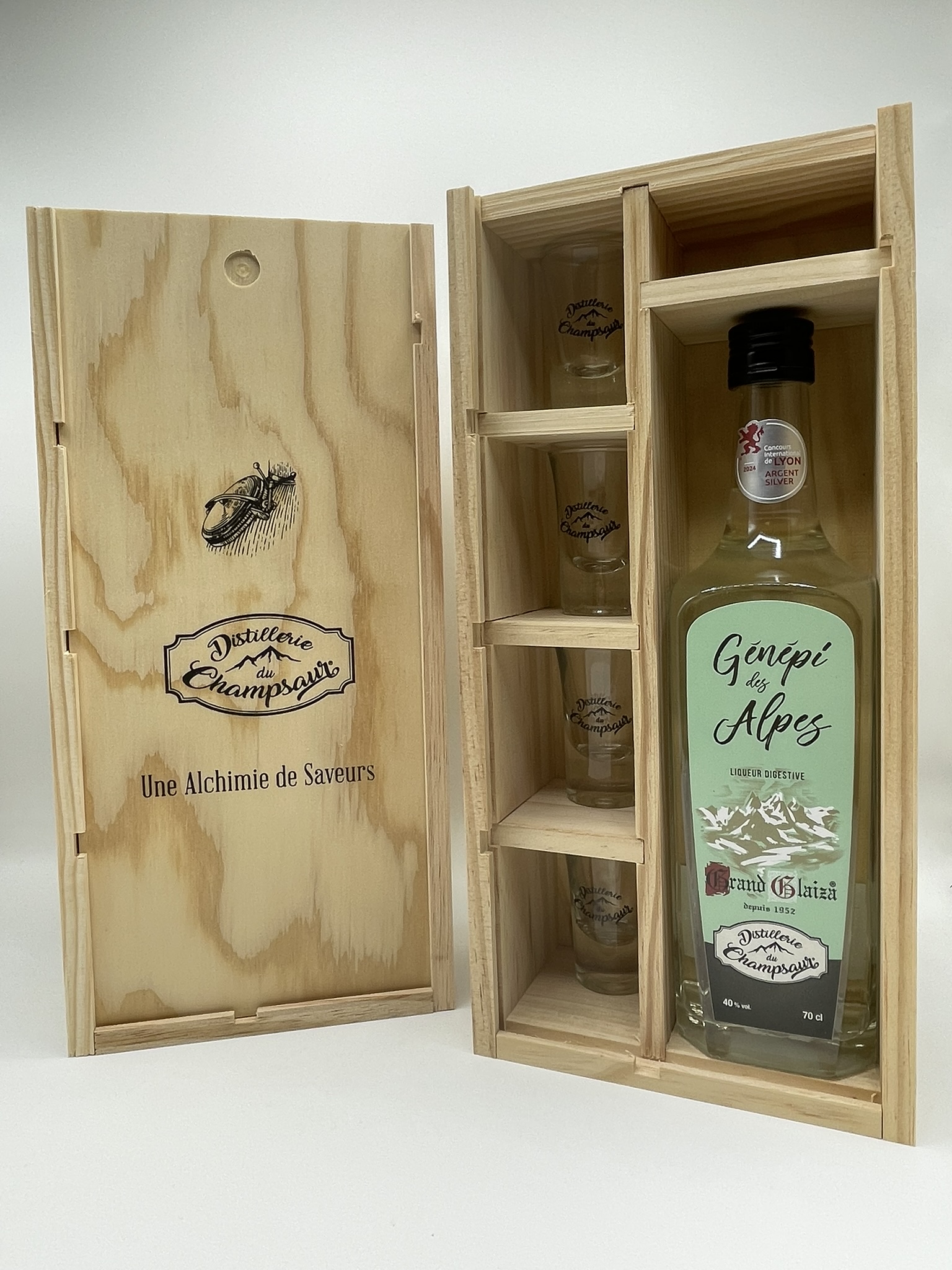 Coffret contenant une bouteille de génépi "Grand Glaiza" en 70cl, ainsi que 4 verres "shooter" pour le déguster en digestif.